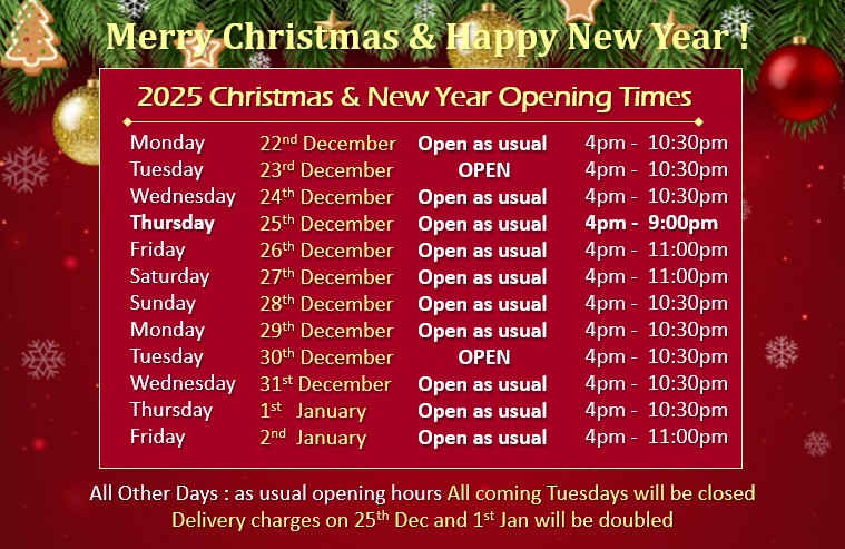 Most of our dishes contain garlic, soya, gluten, cooking wine, sesame oil if you have any allergies to these products, please inform us before before ordering.