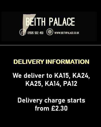 Beith Palace Takeaway Chinese Takeaway serves variety of delicious Chinese dishes. We’re passionate about delivering hot, great tasting, freshly prepared Chinese food to our customers